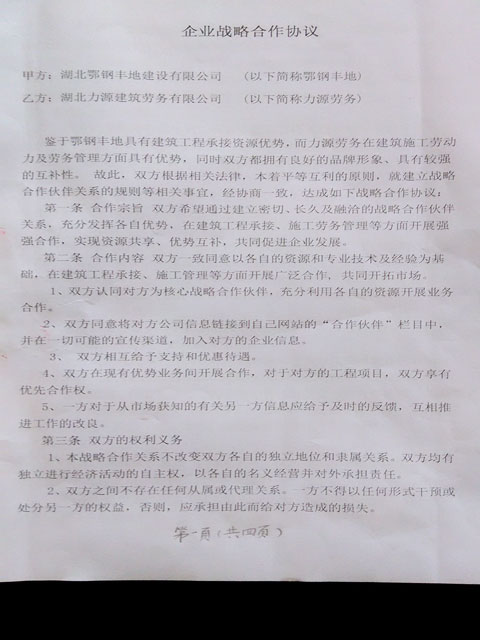 为更好的适应建筑市场要求,树立良好品牌形象,本着平等互利原则,发挥各自优势,战略协作互补,促进企业发展,公司与湖北鄂钢丰地建设有限公司签订战略合作协议